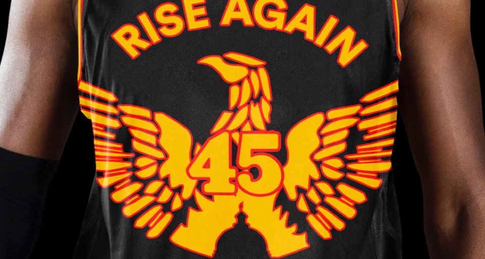 A tribute to the layout of the 90's black hawk uniform, in this case having the black represent ashes, swapping out the cartoon hawk with the phoenix logo and the RISE AGAIN translation from the state flag.