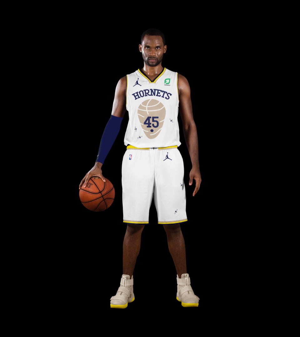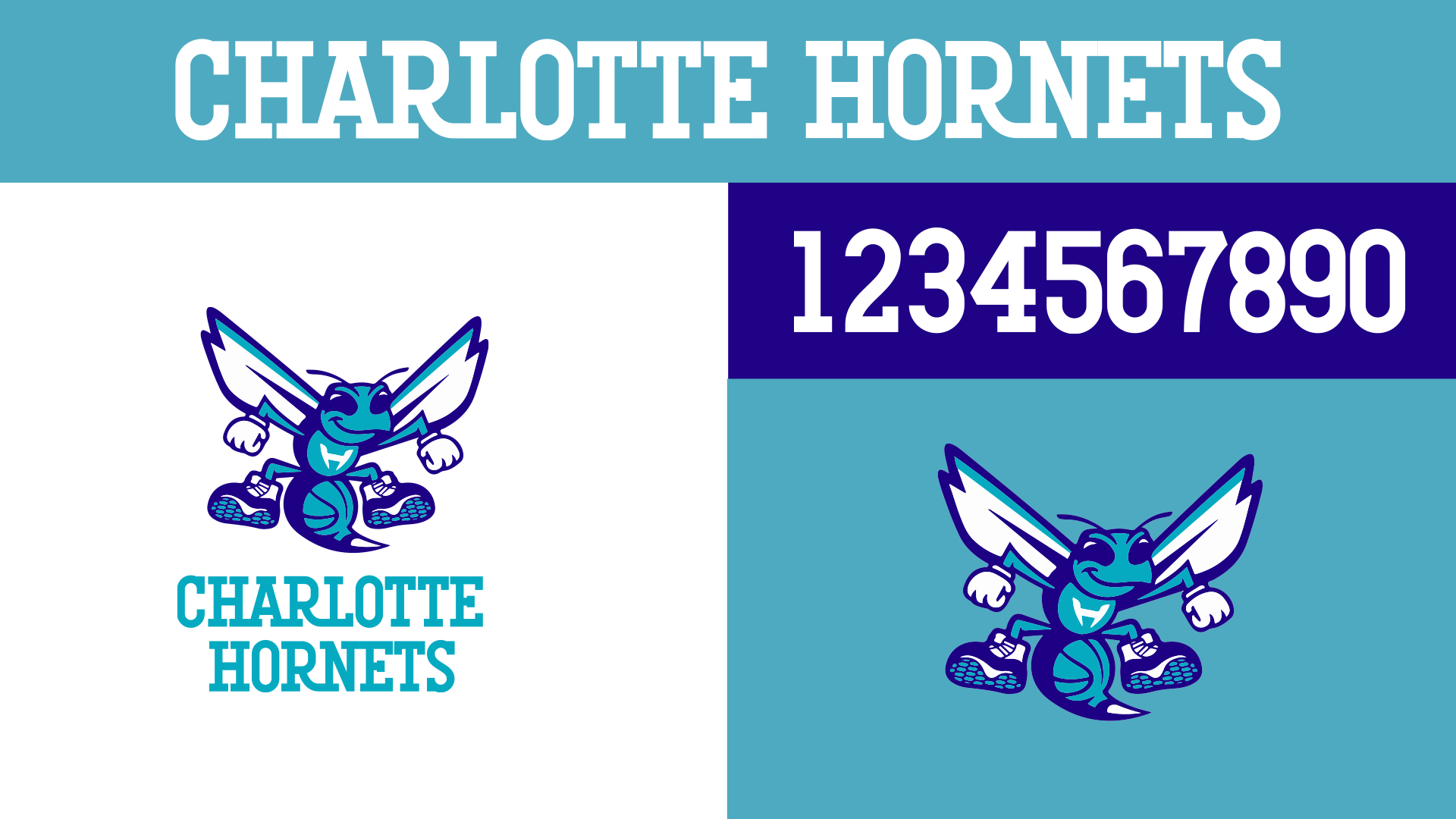We found out as we got into our Hornets research that they actually have a next-gen logo for Hugo the Hornet! Turns out it's incredible, a great balance of old and new, exactly what the primary logo should be (right down to the fact that he's wearing Jordan 11's as a shout out to their owner, MJ). All we had to do was give the color scheme a facelift and bring back a custom slab serif for their wordmark.