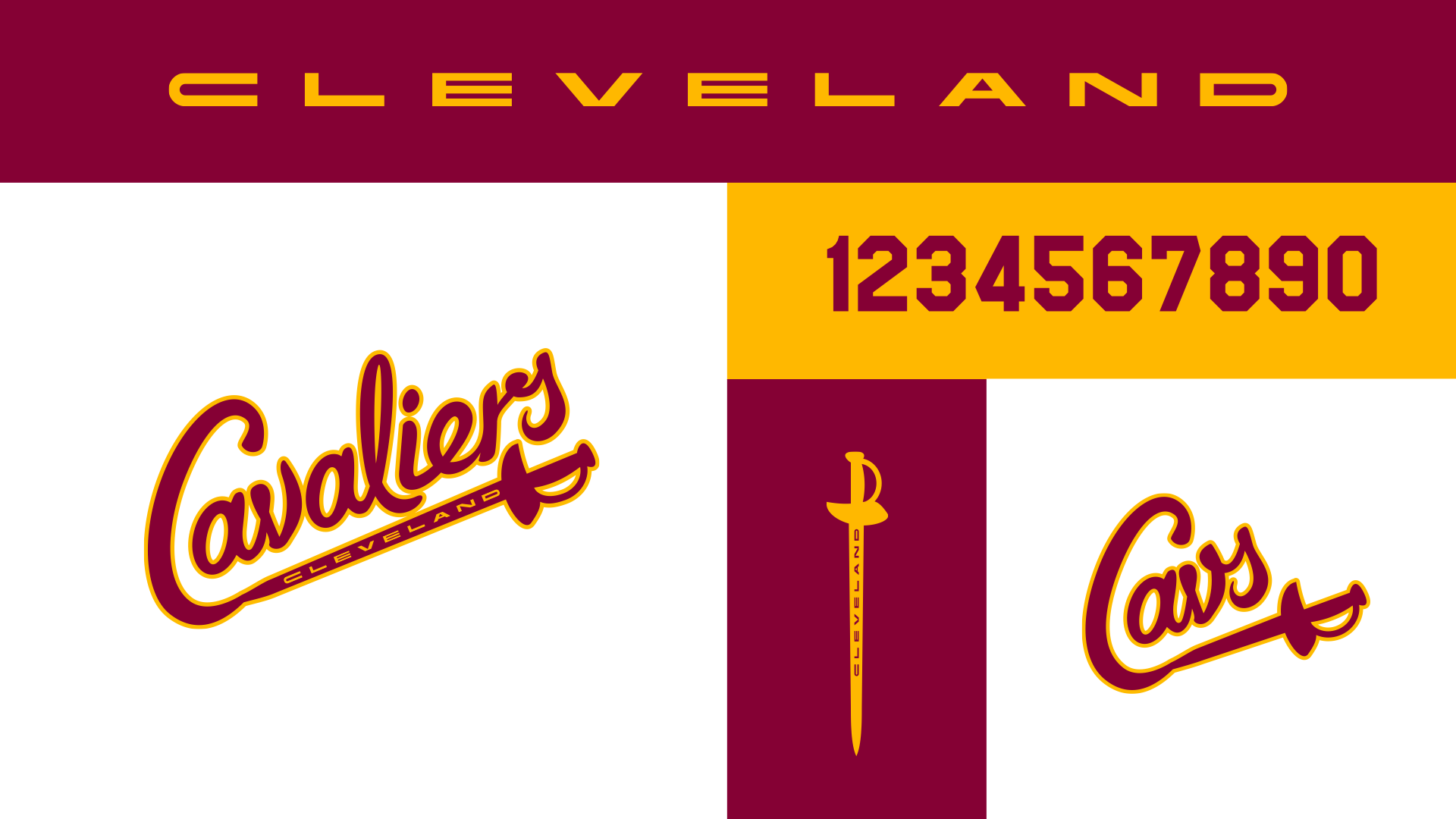 We love the combination of the super extended, cut-from-steel letters for CLEVELAND and the script that feels blue collar and small town at the same time. Added to that are some classic numbers and a a secondary "dagger" logo that says Cavs.