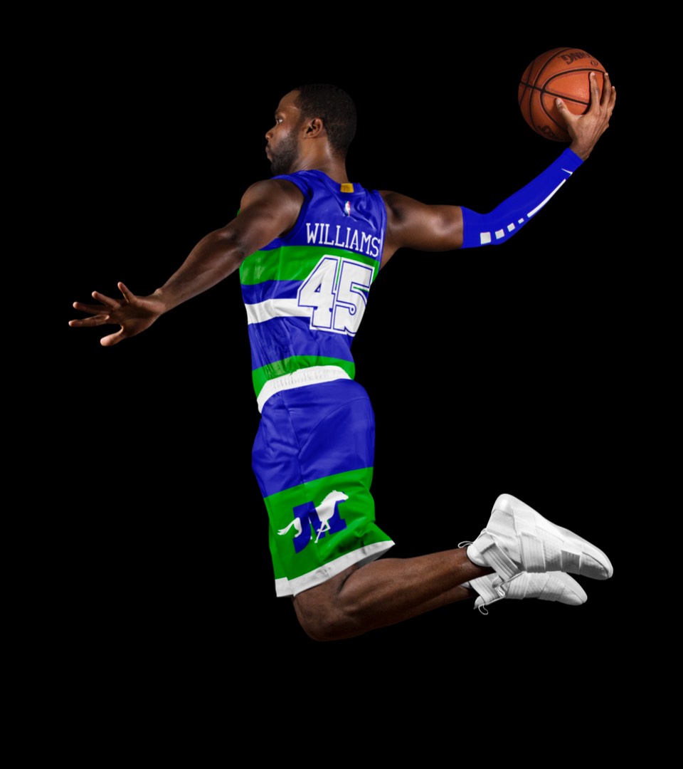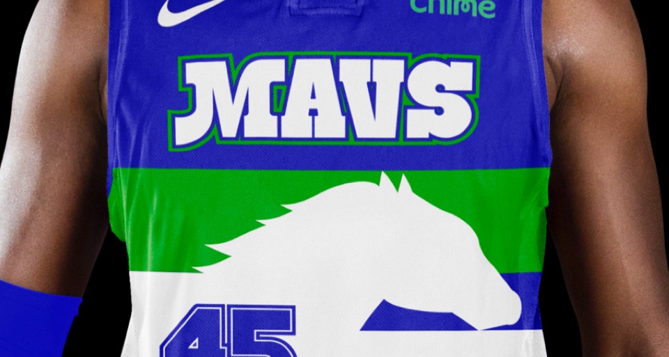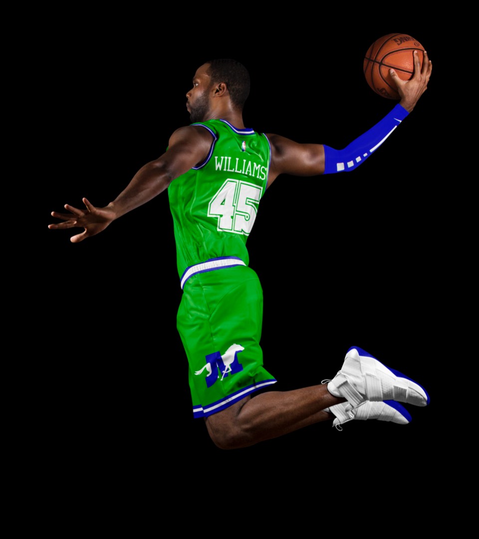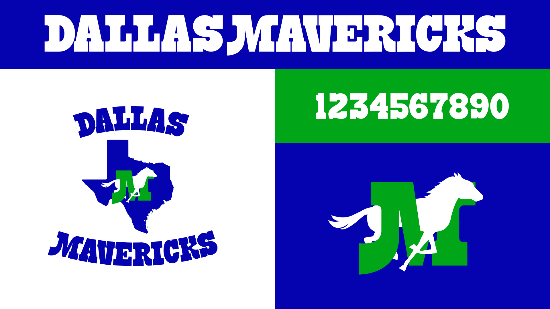 The combo of royal blue and green is surprisingly unique to the NBA, so we brought it back. The horse is now a silhouette running through the letter M, paying homage to the original logo which was an M with a cowboy hat hanging off it. Instead of a basketball as a containing shape, we used the state of Texas.