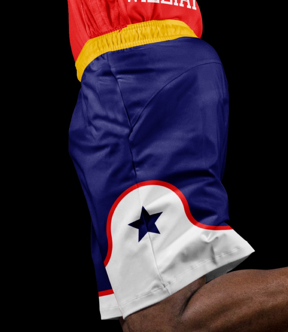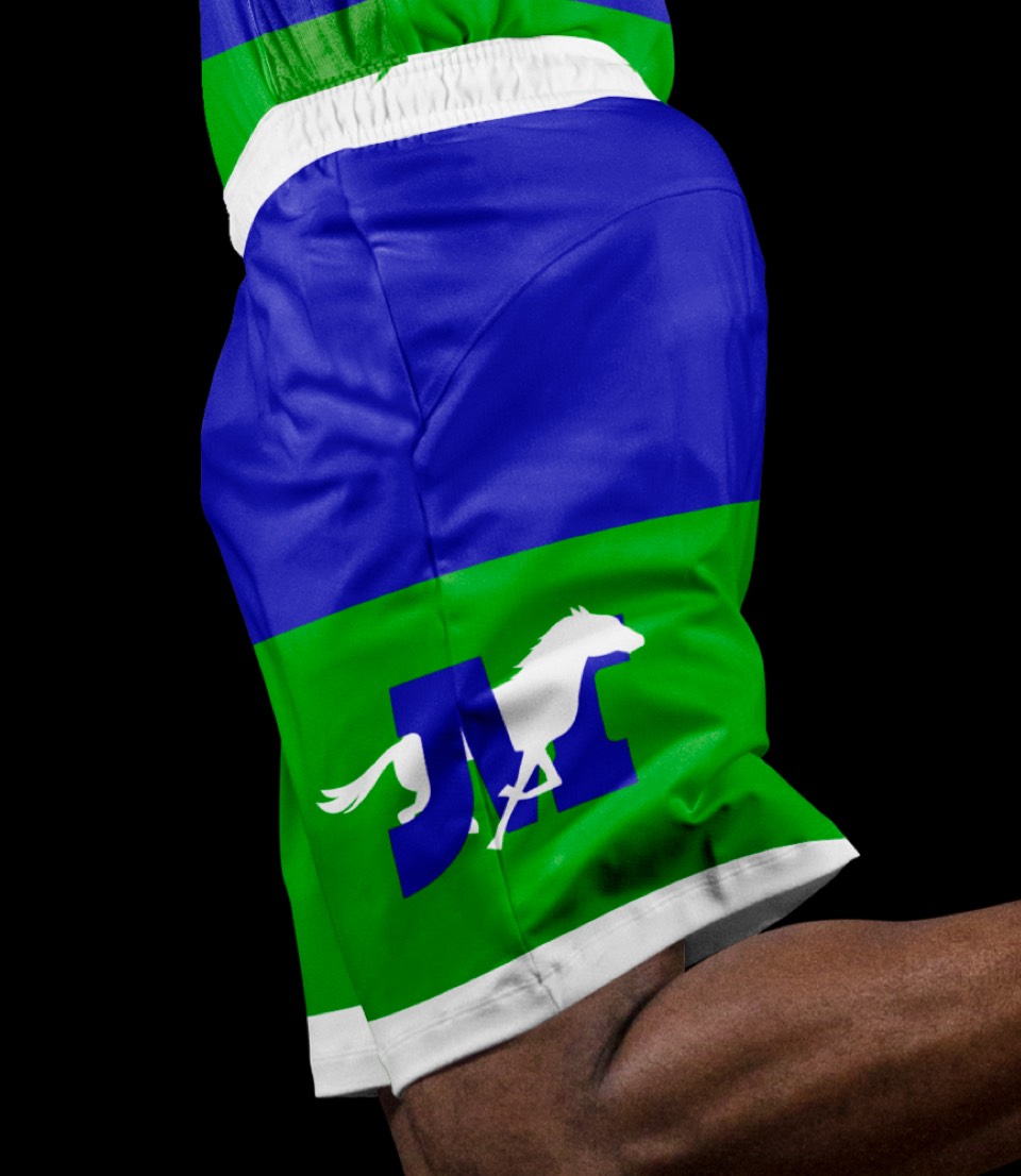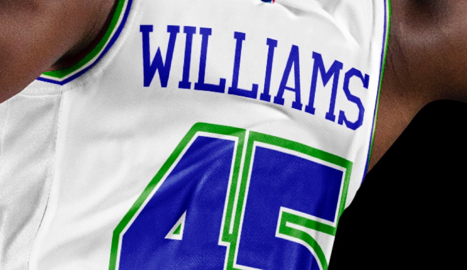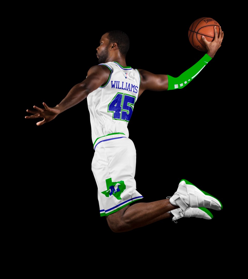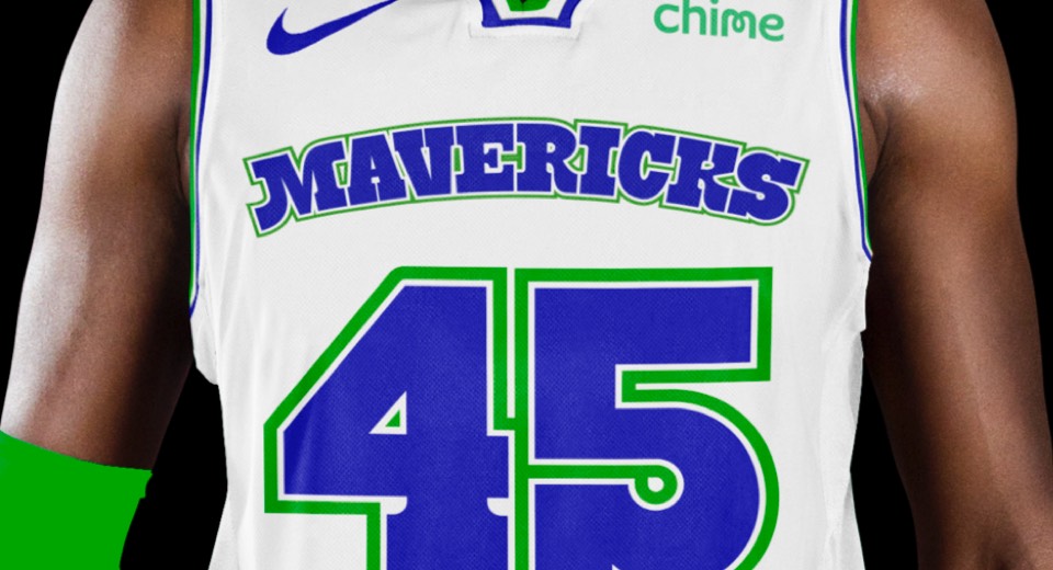 The combo of royal blue and green is surprisingly unique to the NBA, so we brought it back. The horse is now a silhouette running through the letter M, paying homage to the original logo which was an M with a cowboy hat hanging off it. Instead of a basketball as a containing shape, we used the state of Texas.