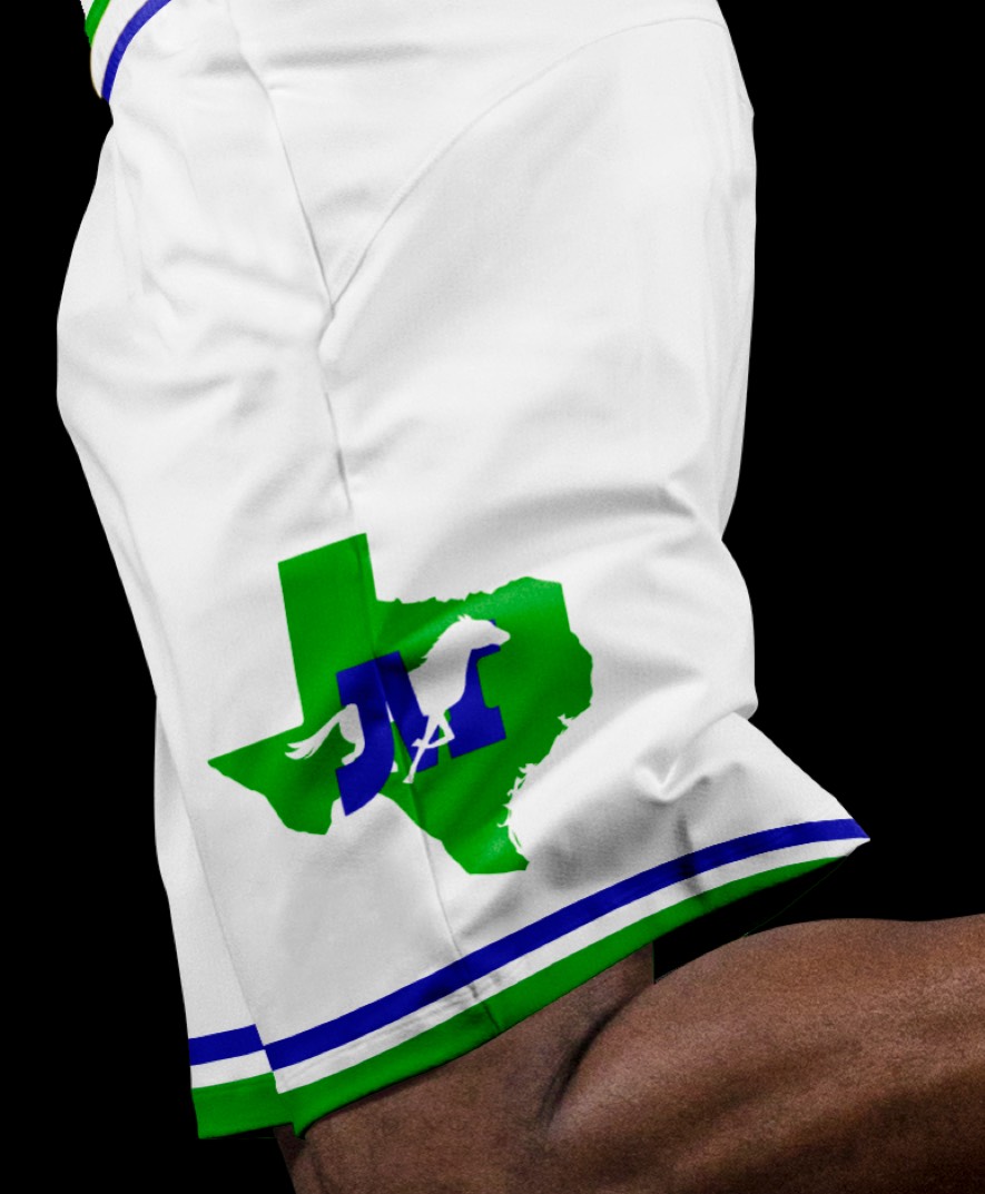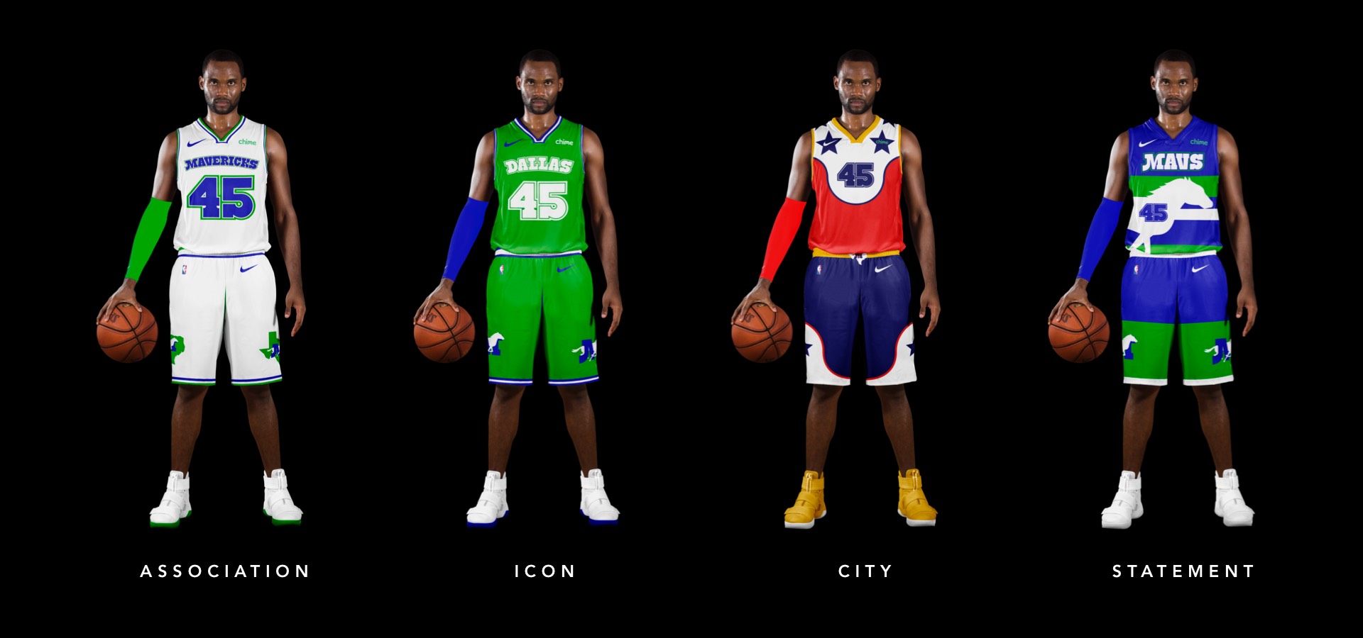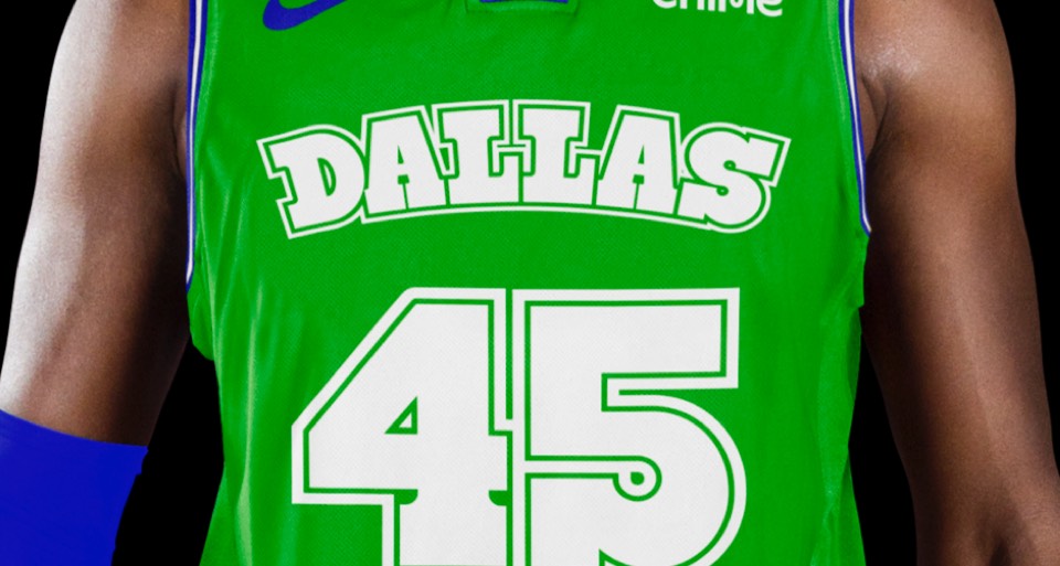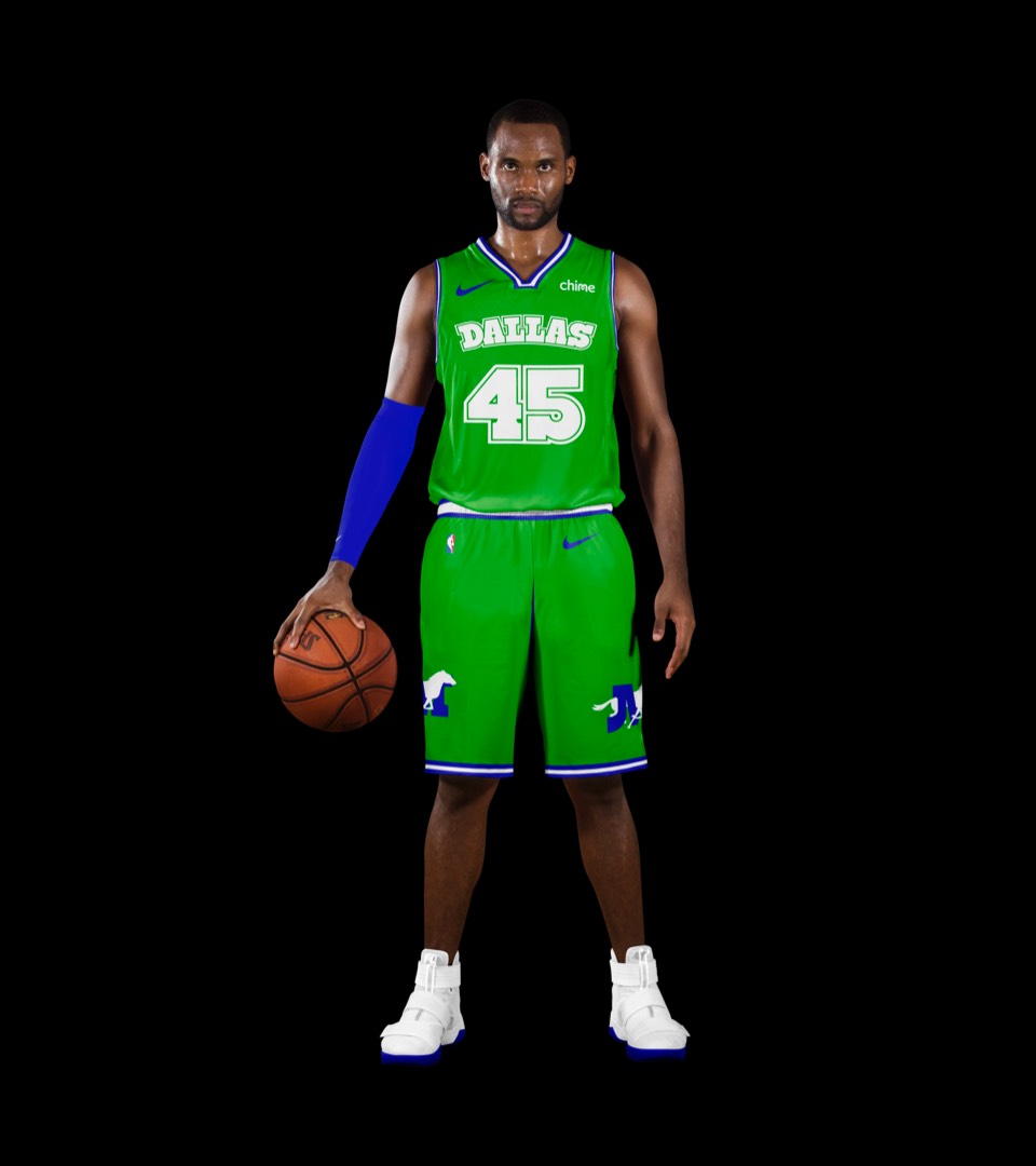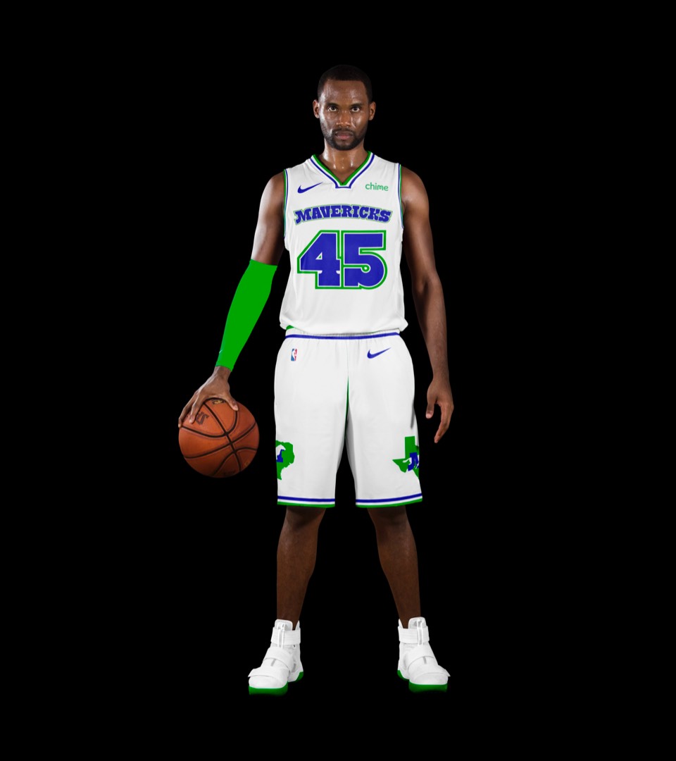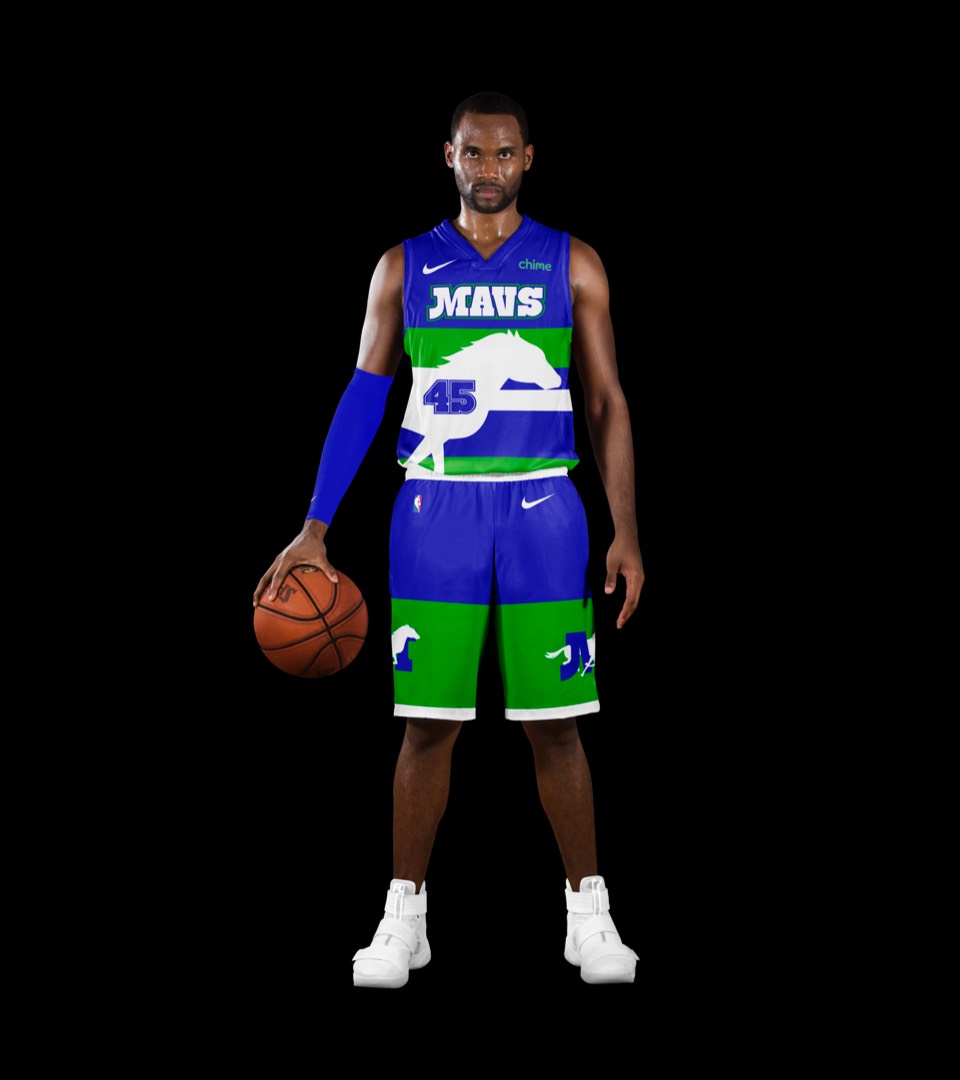 The rare Icon jersey that complements the Association kit without directly duplicating it. Here we have a green background with white on white letters and blue on blue trim. It's less expected but also aligns with the color way for their original uni's. The shorts keep the horse+M icon but lose the state of Texas since the jerseys already say DALLAS on them.
