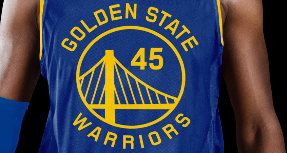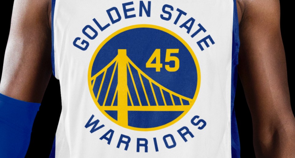 A lot of designers are offended by the off-center (they would say off-kilter) logo; we don't mind it! Leaves room for the numbers on the jersey and with a slightly more iconic rendition of the bay bridge, it can work. Probably one too many strokes on the circle when you compare it to the 60's era stuff, and by far the most offensive element is the lettering, which between the uneven structure, the arbitrary spurs and the fact that WARRIORS is slightly bigger than GOLDEN STATE... probably best to start fresh.