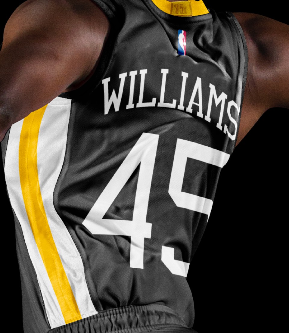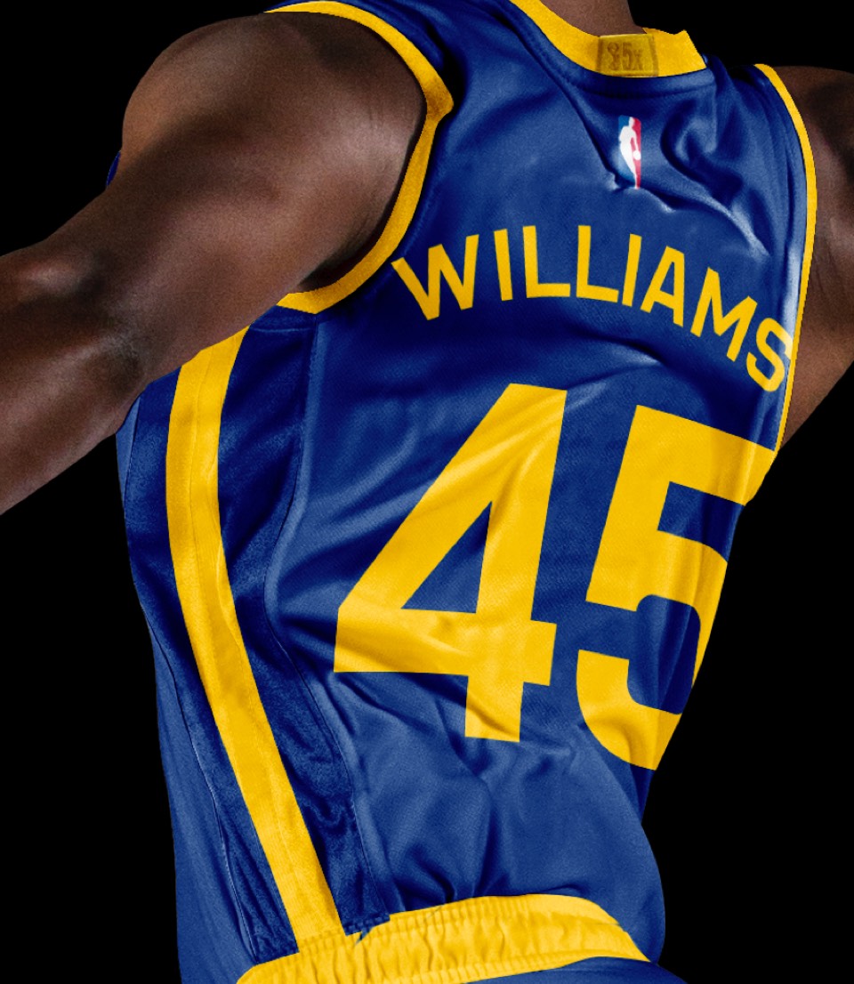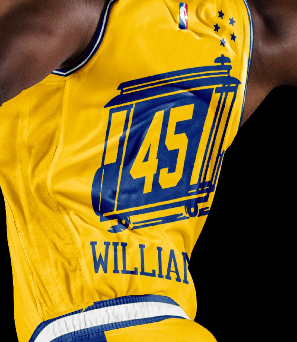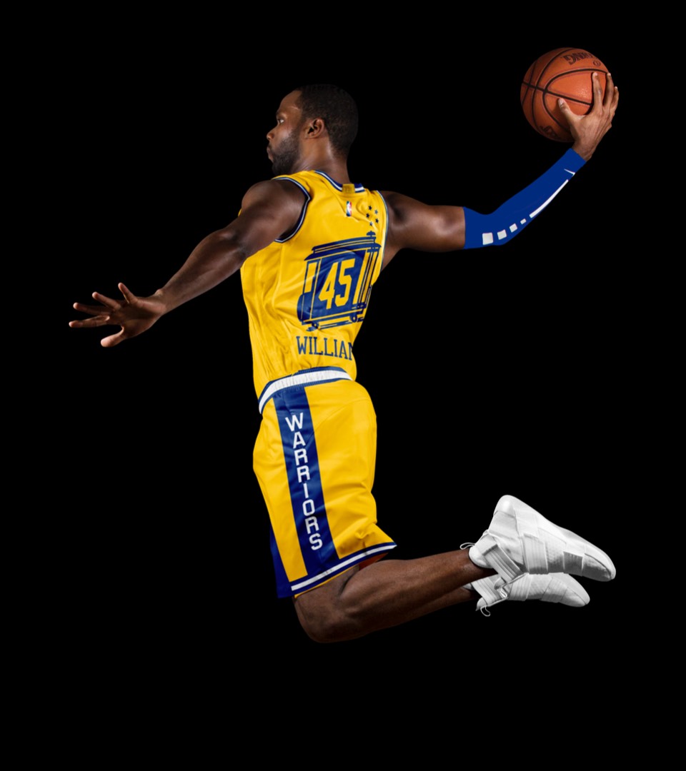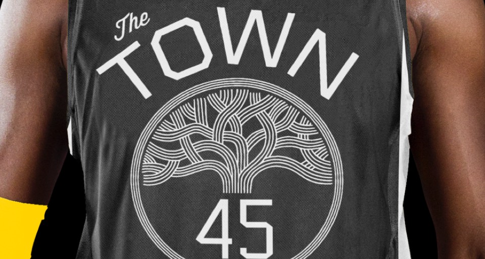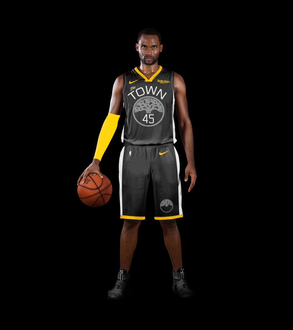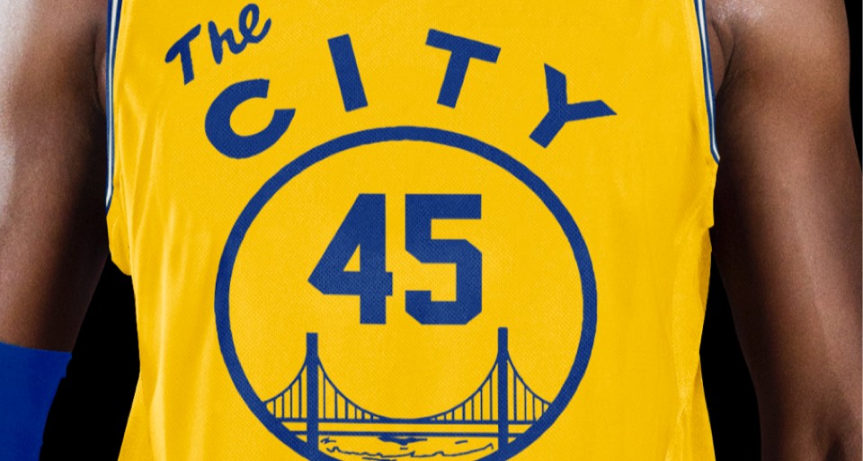The recent THE TOWN city jersey was a perfect complement to the hardwood classic and it feels right to rep both Oakland and San Francisco here. We went with the yellow trim (superior to the blue version) and simplified the side stripes to match the other uniforms.