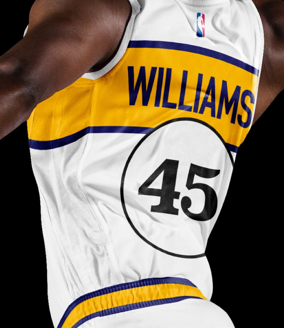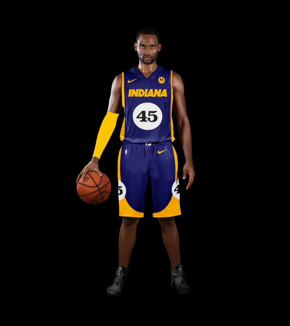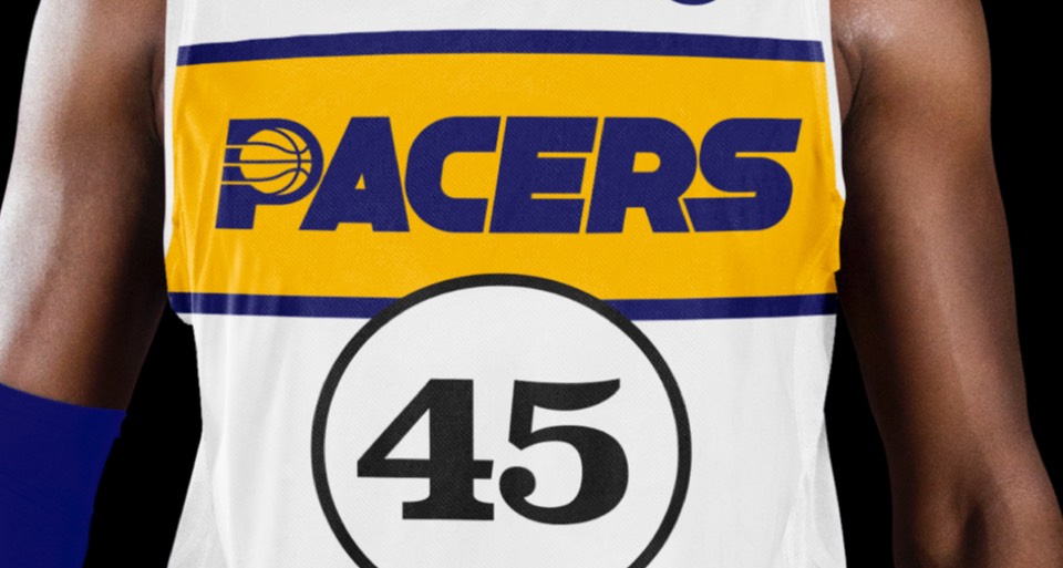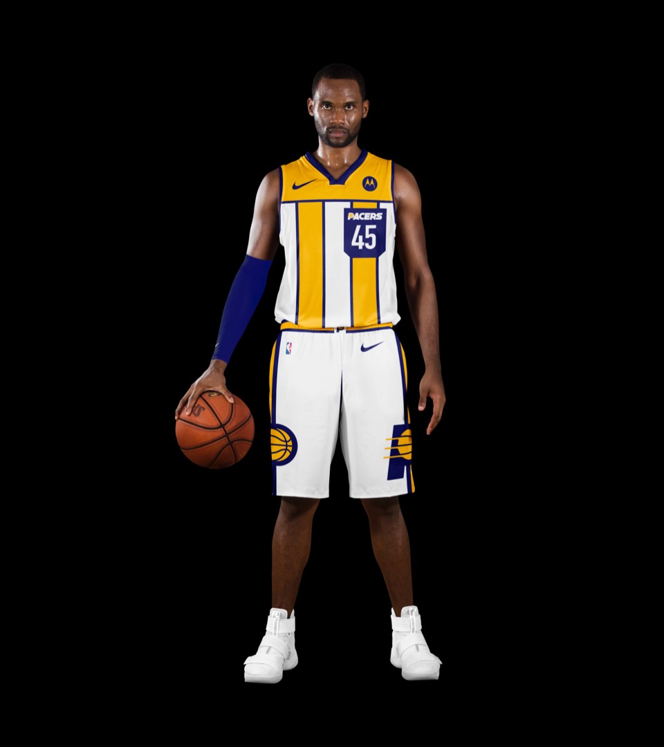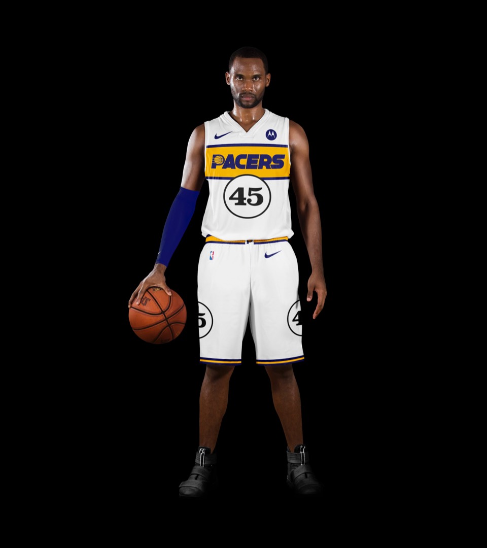 We've promoted the pace car theme last seen on the city jerseys to the primary expression for Indy. The white uniforms draw on a previous Pacers kit with a horizontal racing stripe across the chest that wraps around to house the player name on back. Rounded out with the iconic circular racing numbers on the front and sides and black shoes for the "tires".