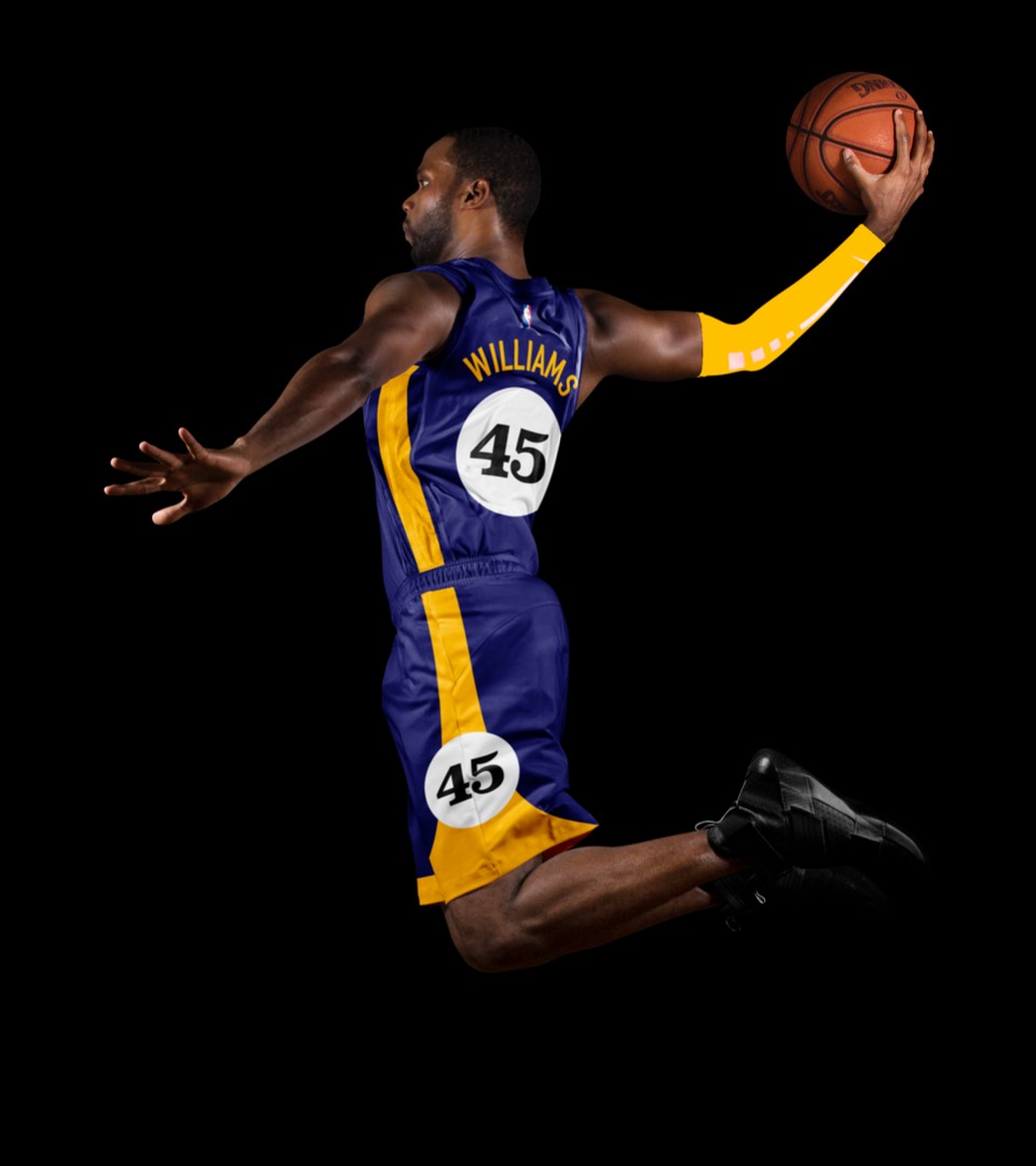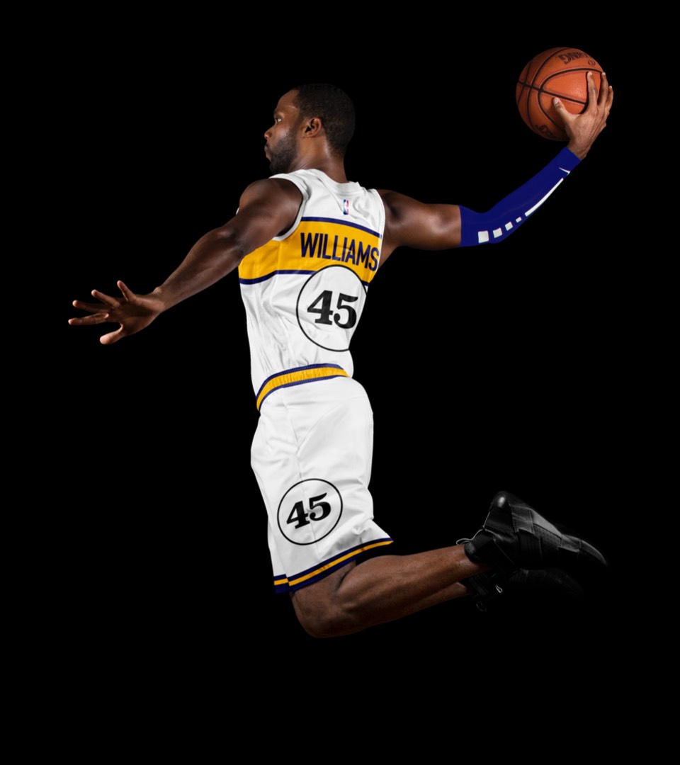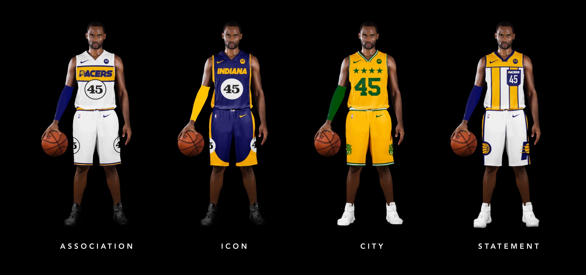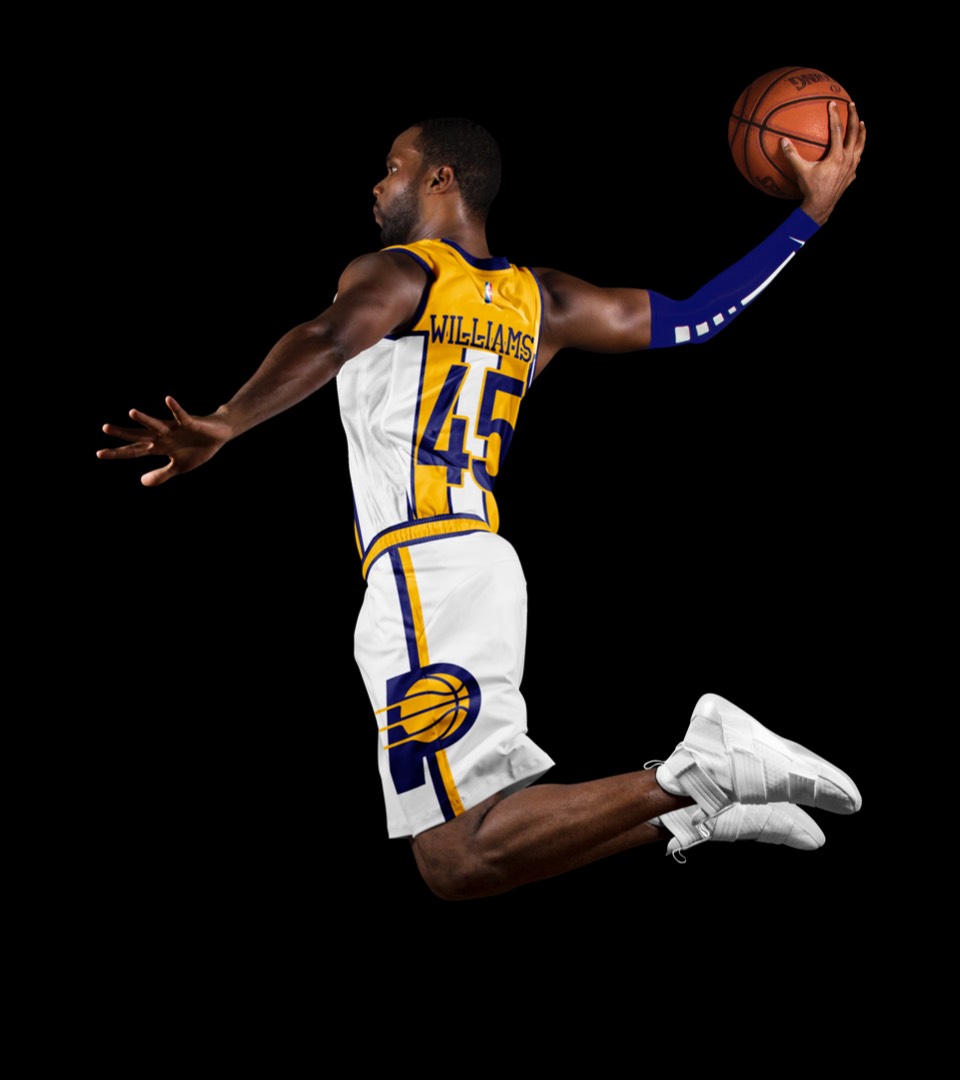 We've promoted the pace car theme last seen on the city jerseys to the primary expression for Indy. The white uniforms draw on a previous Pacers kit with a horizontal racing stripe across the chest that wraps around to house the player name on back. Rounded out with the iconic circular racing numbers on the front and sides and black shoes for the "tires".