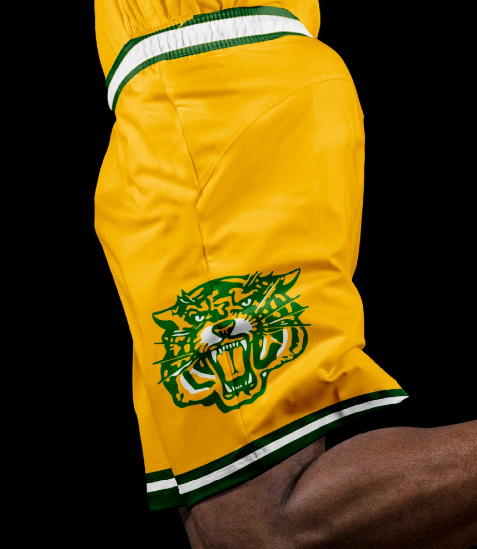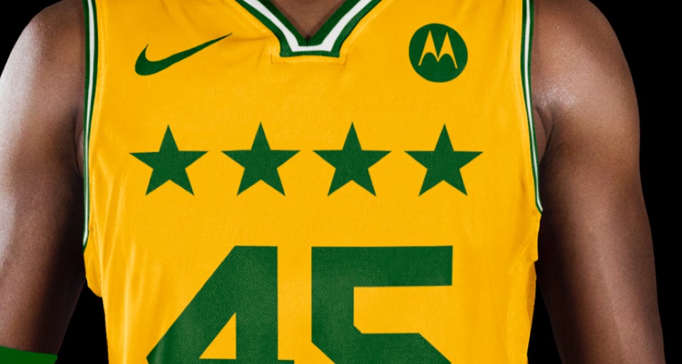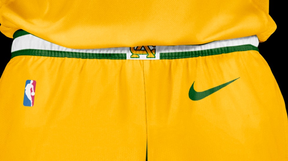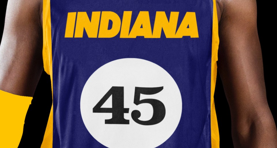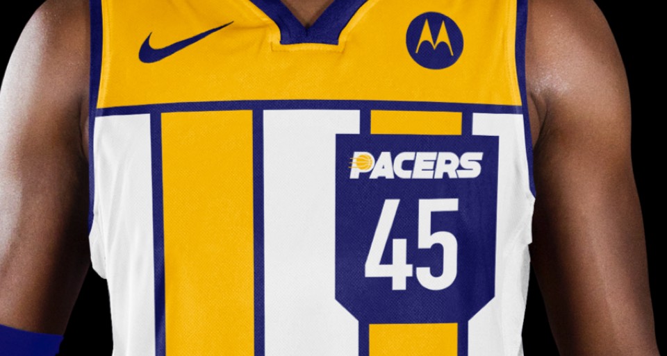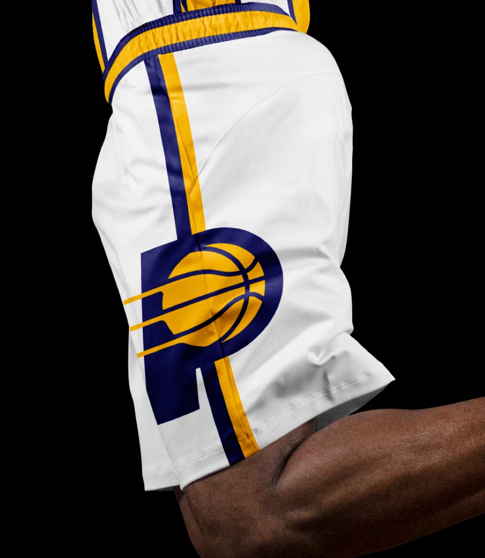 We can't forget that the Pacer name comes from horse racing. Before pace cars, it was pacer horses that made Indiana famous. This jockey-inspired design features two vertical stripes, a breast "pocket" with the PACERS secondary logo and number, and a huge P monogram on the shorts.