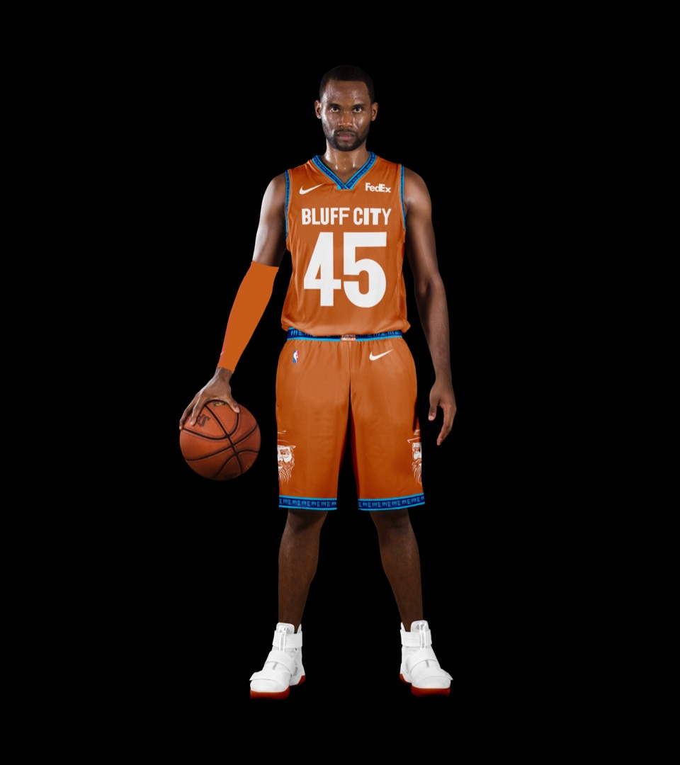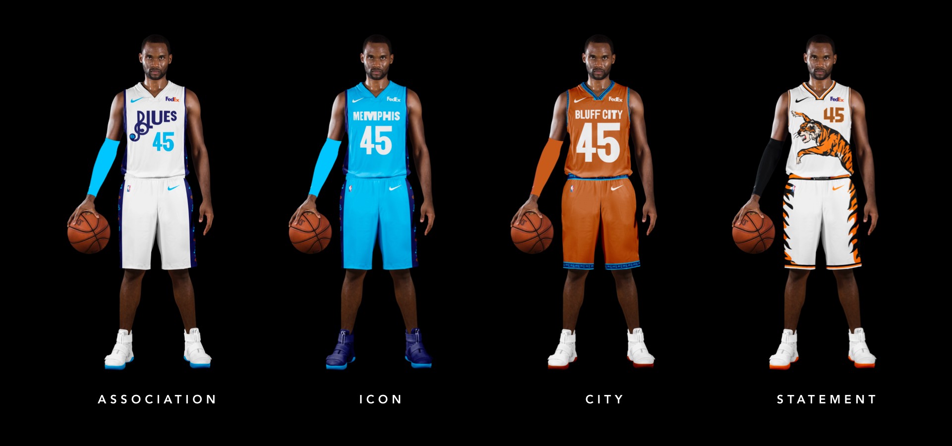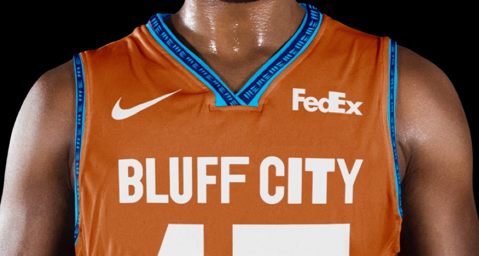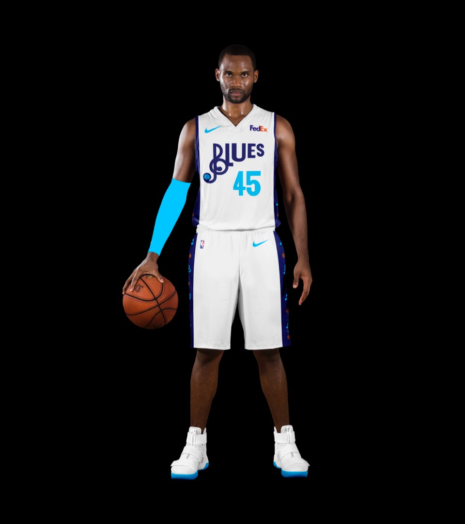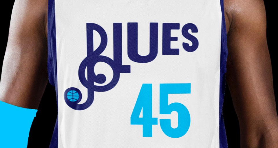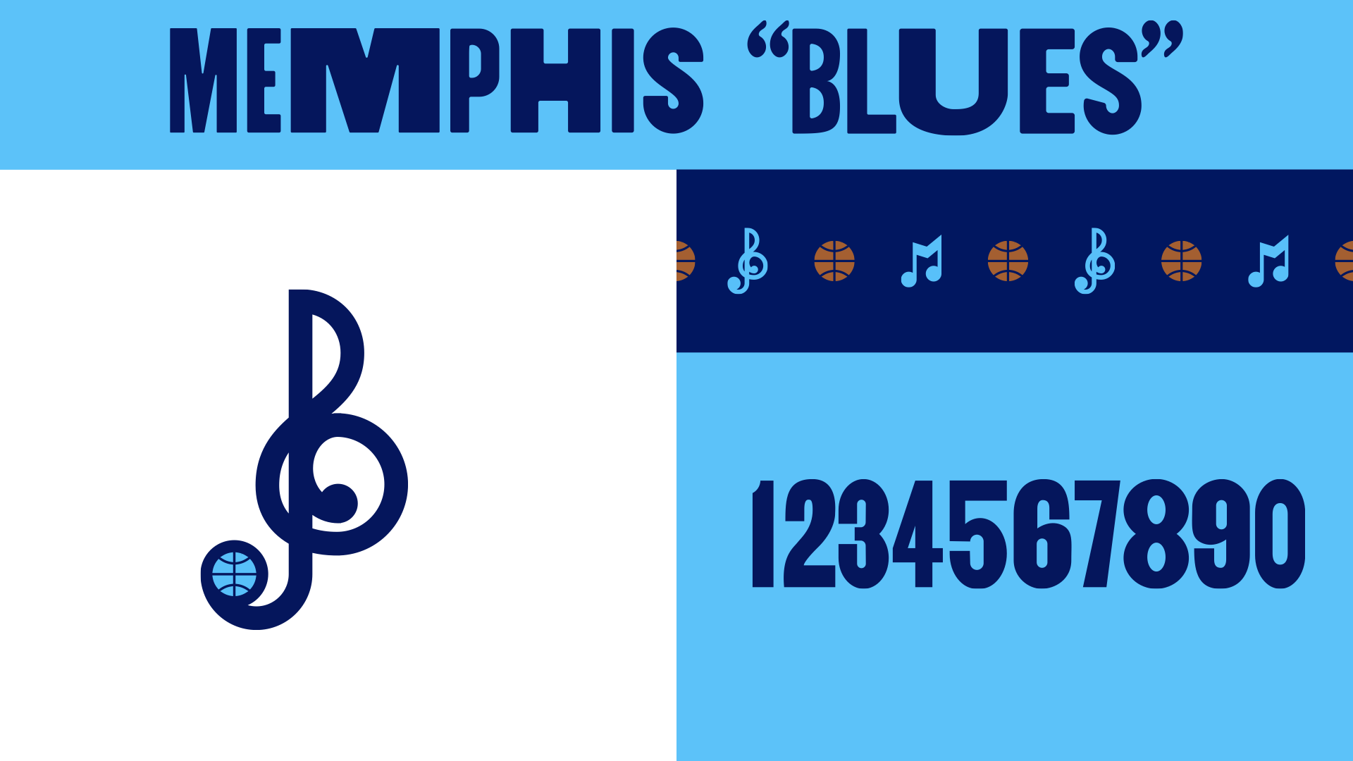 Colors stick with blue on blue as our primary palette but with a brighter light blue for a more vibrant energy. We replaced the yellow with the brown from the Vancouver palette to signify the Chickasaw Bluff. And we built a music-note-plus-basketball pattern inspired by some of the typographic ornaments that would appear on old blues posters