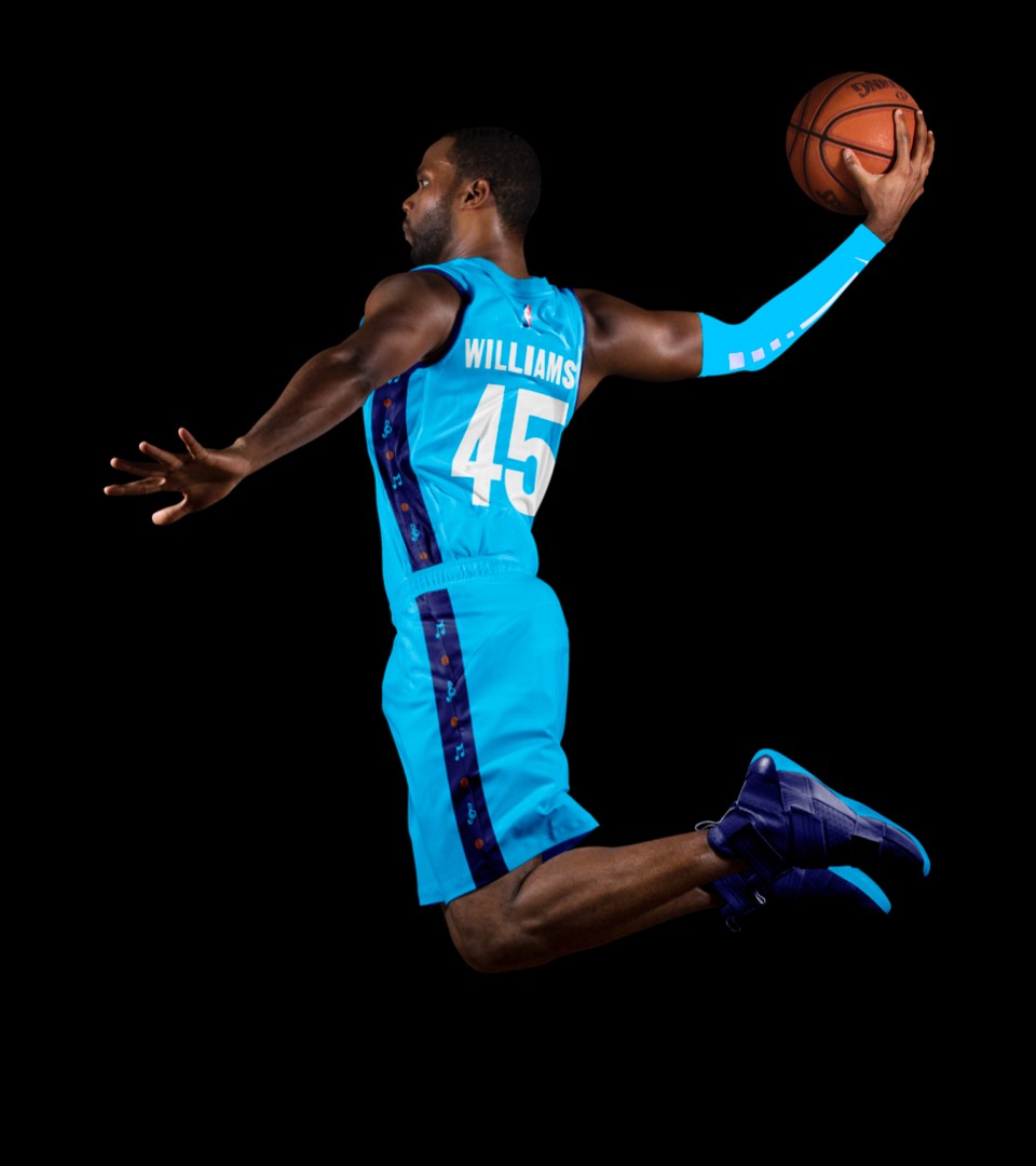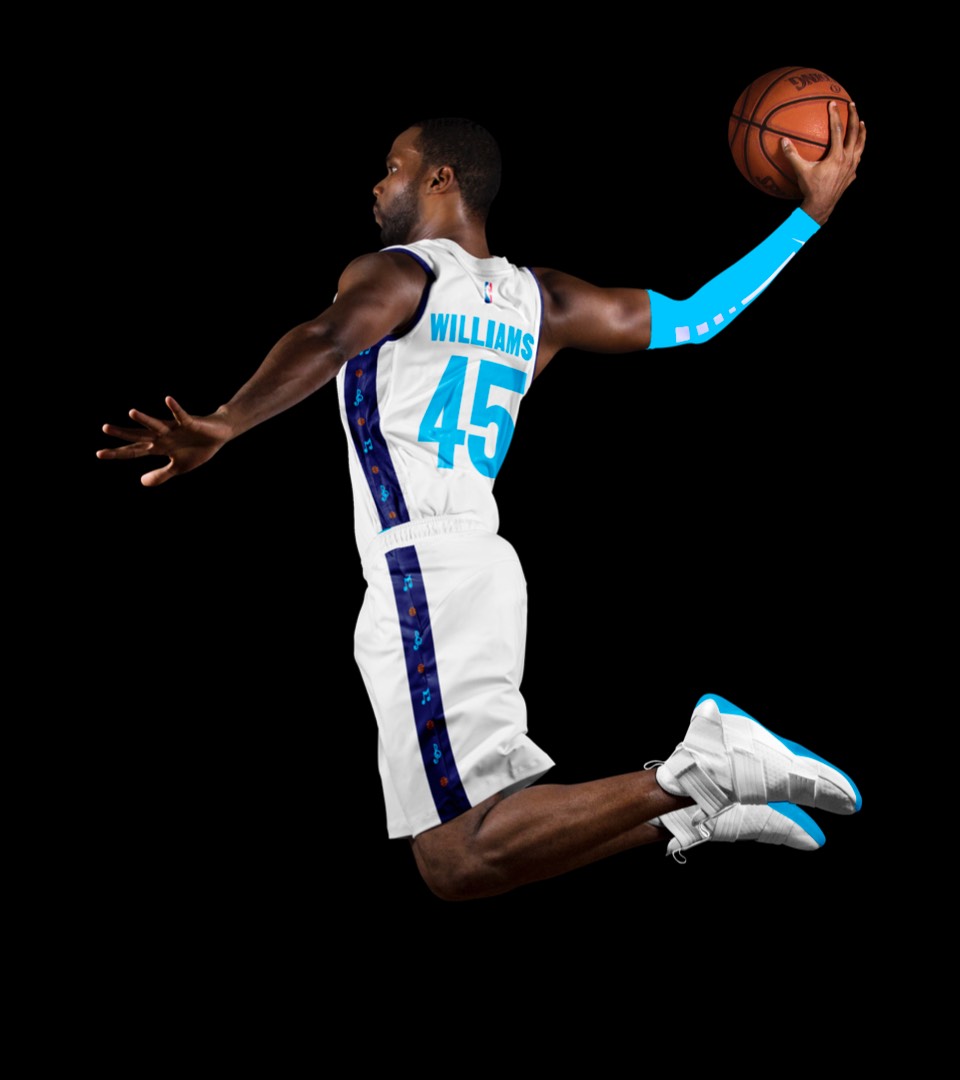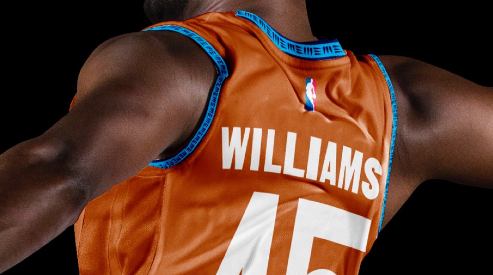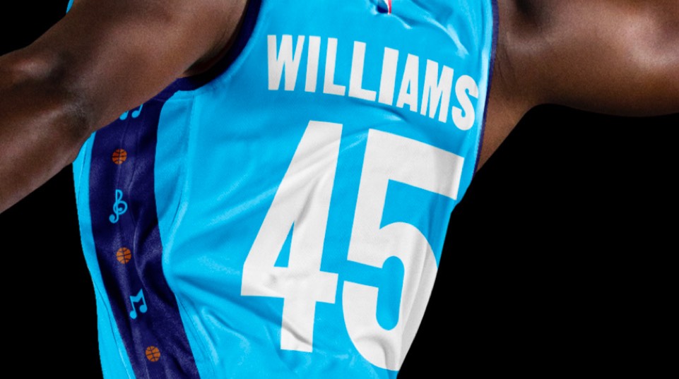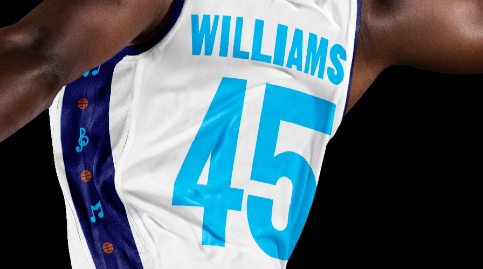 The blue on white pops, and we extended the woodcut type to the numbers for a distinct look that's still worthy of Grit and Grind. Our new blues pattern appears within the side stripes on navy.