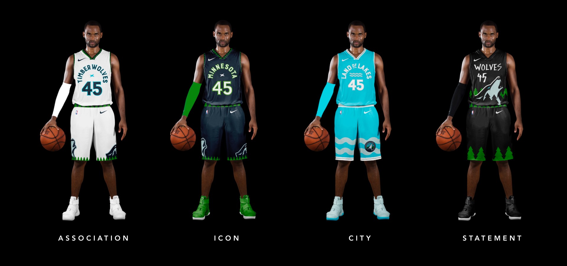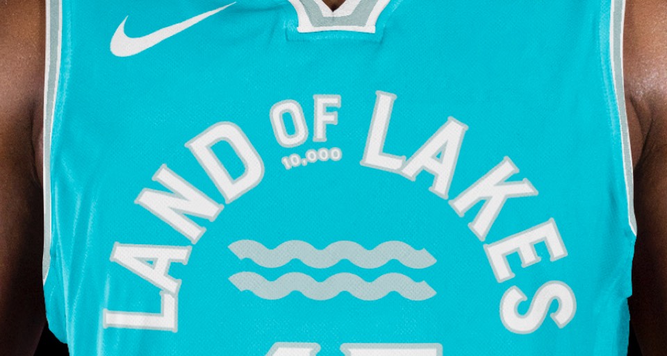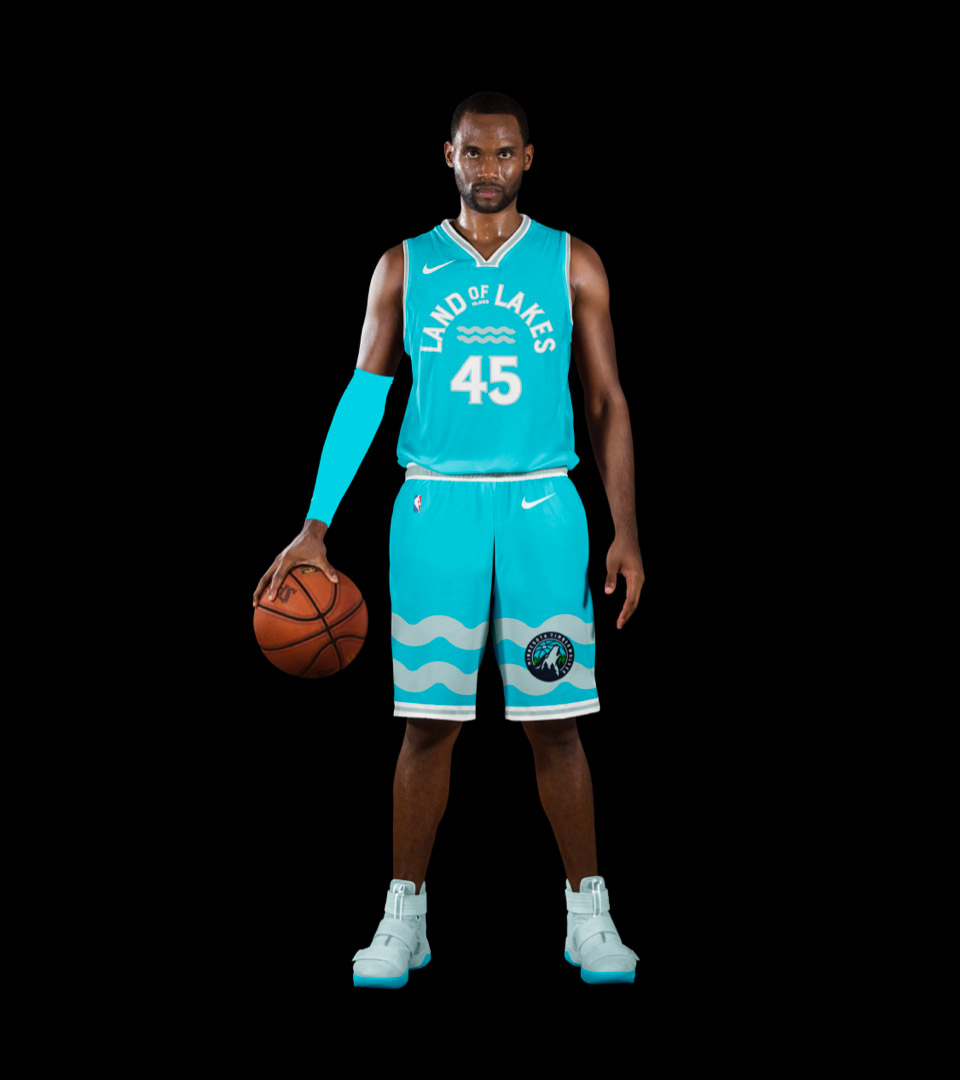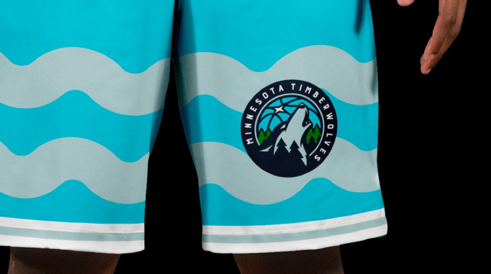 Land of 10,000 lakes, featuring the lake blue accent color. Still inspired by their new signature layout, but replacing the North Star in the center with a water icon, which gets repeated on the shorts behind a knee patch of the primary logo.
