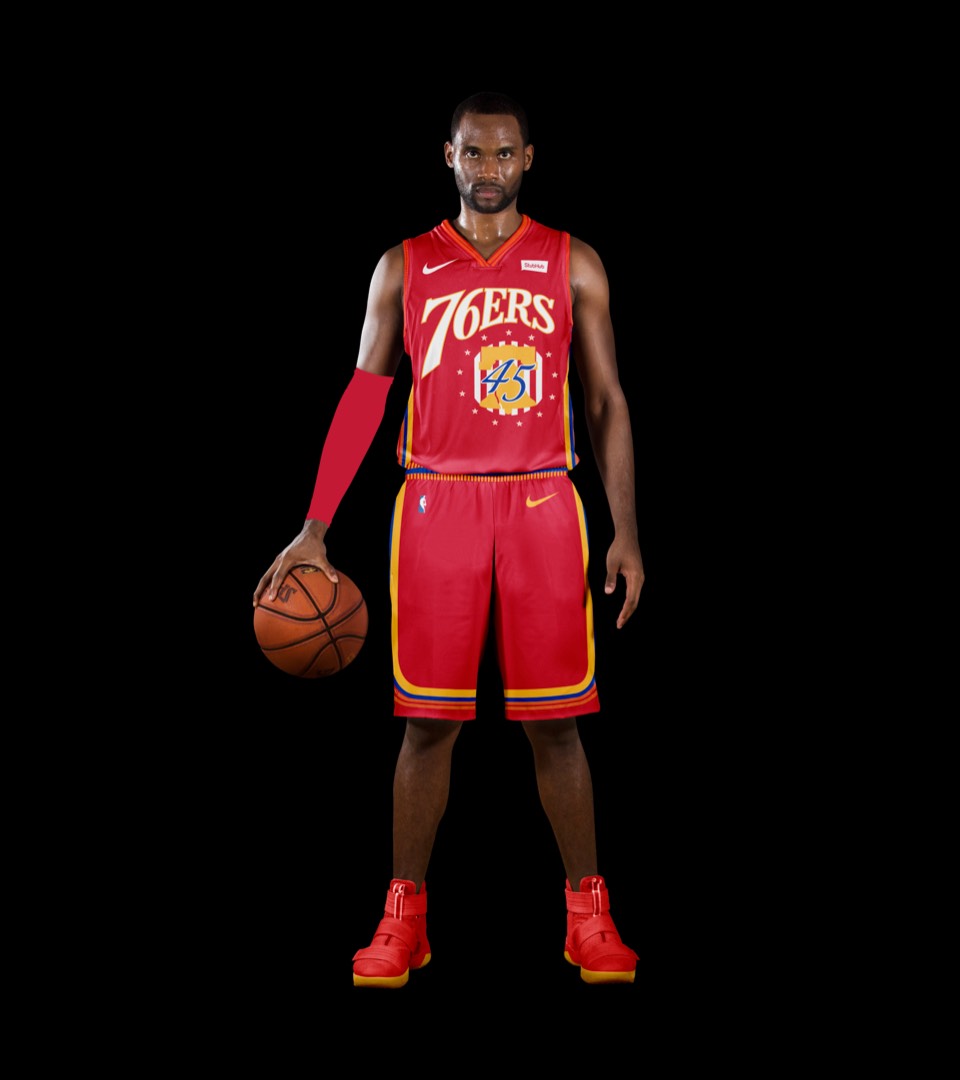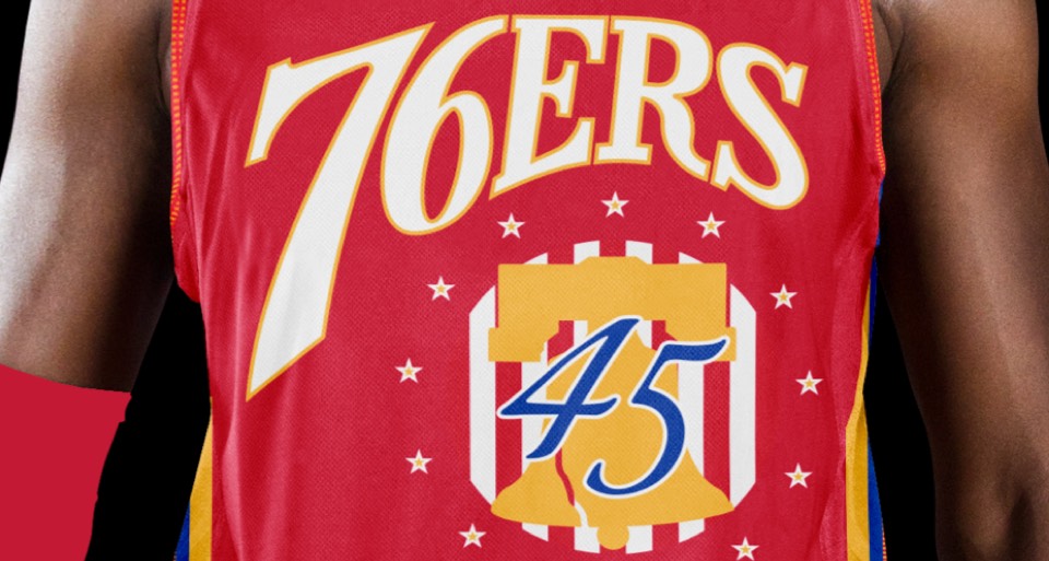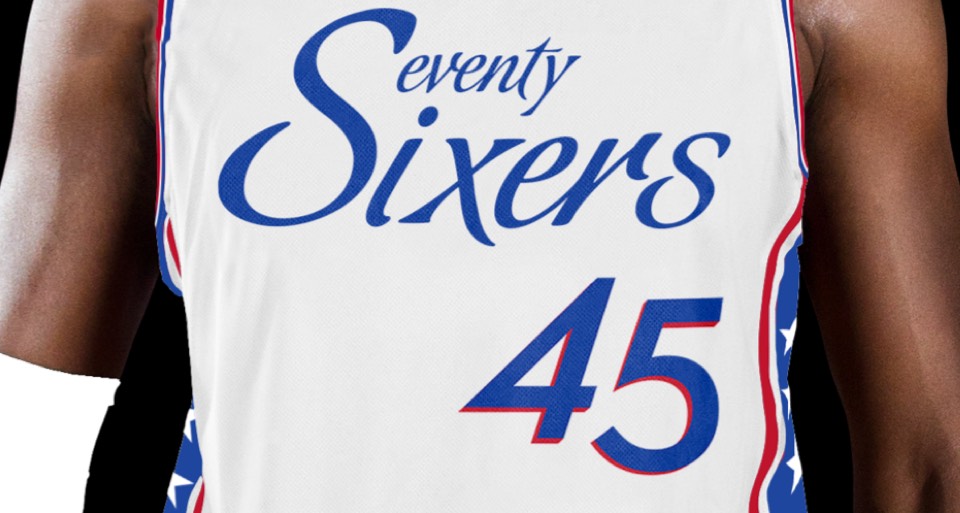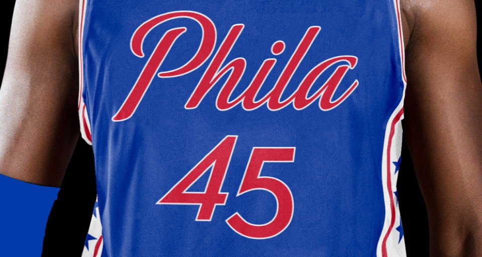 Bye block letters. The Sixers have been playing with a script font reminiscent of the declaration of independence for the past several years in their city and statement jerseys. Our goal was to bring that more to the forefront to create a more ownable look rather than the block letters in their current kits. The secondary liberty bell logo is inspired by their original Syracuse Nationals logo. We've paired this script type with a new number system that extends from their secondary "76" logo.