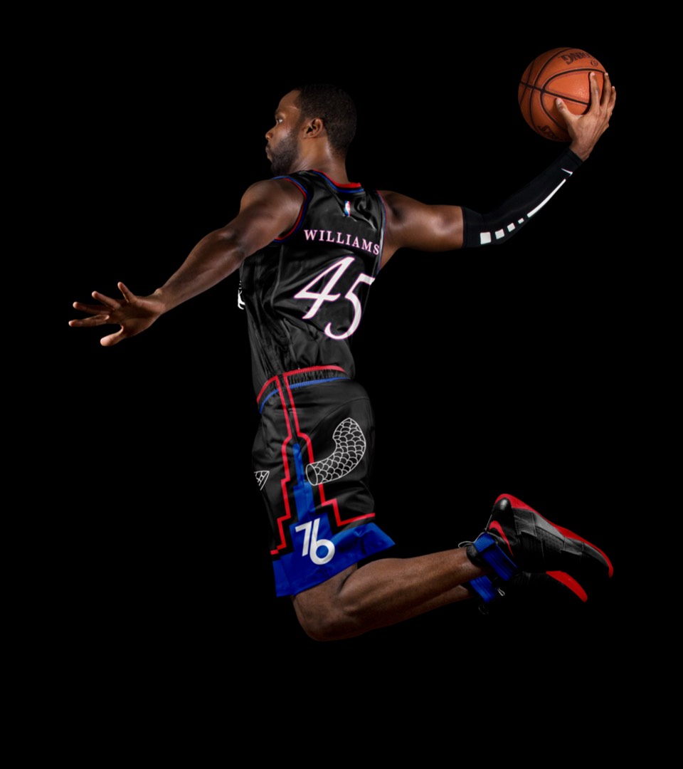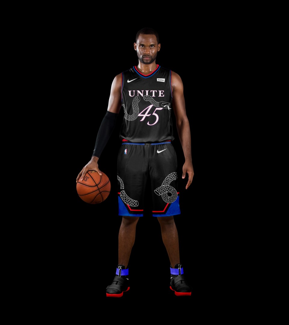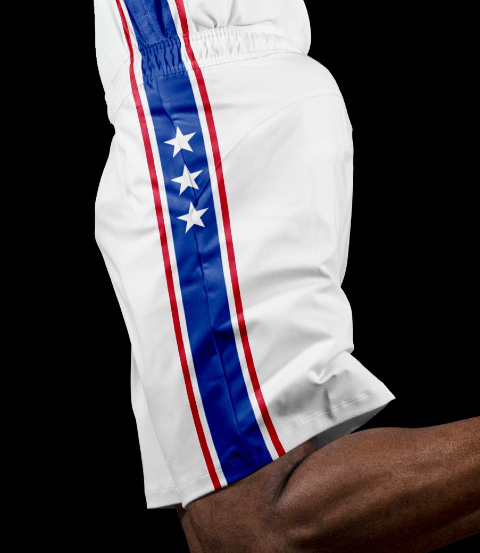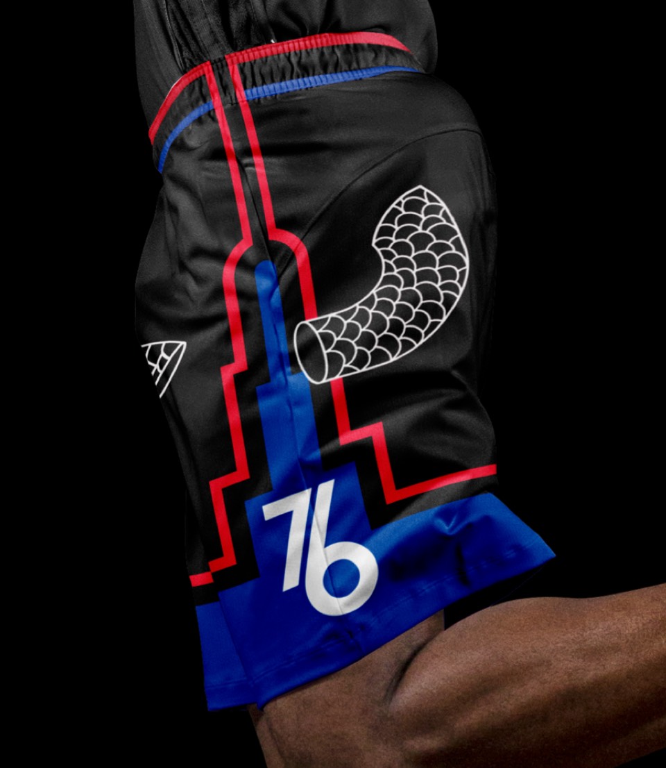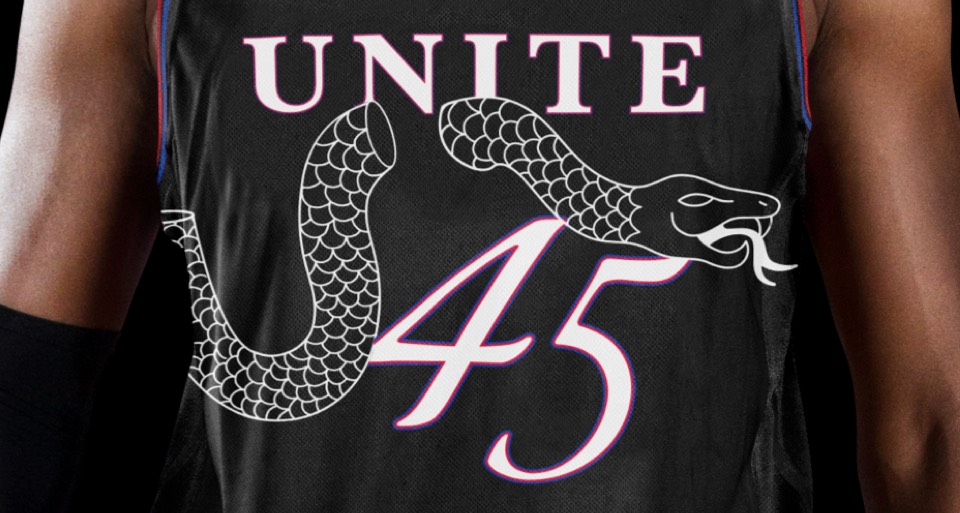The fans have been clamoring to bring back the black uniforms for years. This look incorporates the Ben Franklin's illustrated "Join or Die" snake from the revolution and wraps it around the uniform. We chose the word "Unite" as the Sixers have been using that in pairing with the Snake graphic. Finally, the shorts are an abstracted look at Independence Hall.