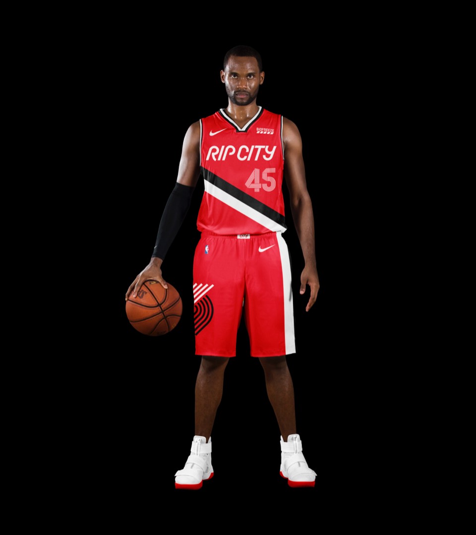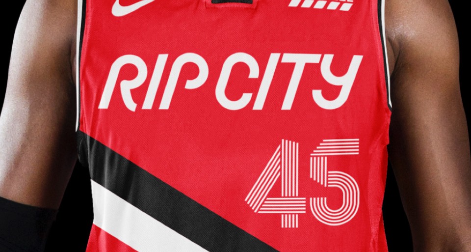 Keeping it as simple as possible here. The iconic double stripe that angles down across the jersey and down the left leg, plus the huge new logo on the right leg. Add our new letters and numbers, with the RIP CITY belt buckle, and we're done.